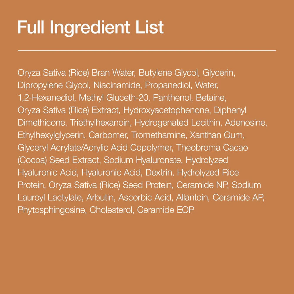 Oryza Sativa (Rice) Bran Water(71 %), Butylene Glycol, Glycerin. Dipropylene Glycol, Niacinamide, Propanediol, Water, 1,2-Hexanediol, Methyl Gluceth-20, Panthenol, Betaine, Oryza Sativa (Rice) Extract(3,753ppm), Hydroxyacetophenone, Diphenyl Dime thicone, Triethylhexanoin, Hydrogenated Lecithin, Adenosine. Ethylhexylglycerin, Carbomer, Tromethamine, Xanthan Gum. Glyceryl Acrylate/Acrylic Acid Copolymer, Theobroma Cacao (Cocoa) Seed Extract, Sodium Hyaluronate, Hydrolyzed Hyaluronic Acid, Hyaluronic Acid, Dextrin, Hydrolyzed Rice Protein (3,000ppb), Oryza Sativa (Rice) Seed Protein(3,000ppb), Ceramide NP, Sodium Lauroyi Lactylate, Arbutin, Ascorbic Acid, Allantoin, Ceramide AP, Phytosphingosine, Cholesterol, Ceramide EOP